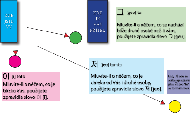 Protože slova 이, 그 a 저 mohou být v korejštině použita pouze jako členy modifikující jiná slova, chcete-li použít "toto" "to" či "tamto" samostatně, musíte za ně přidat slovo [geo] nebo [geot].